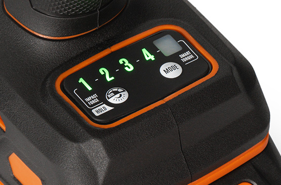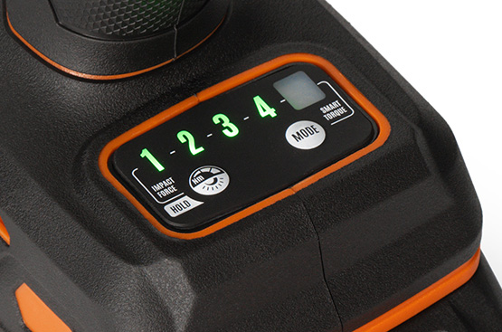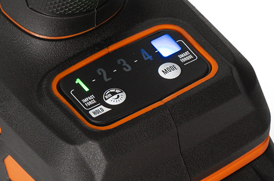 Гайковерт обладает 4 интеллектуальными режимами работы: «1 AUTO» Автоматическая остановка. При закручивании - остановка при появлении нагрузки. При откручивании – остановка при прекращении нагрузки. «2 AUTO» Автоматическая остановка с докручиванием. При закручивании - остановка через 0,5 с при появлении нагрузки. При откручивании – остановка через 0,2 с при прекращении нагрузки. «3 AUTO» Автоматическая снижение скорости. При закручивании - остановка через 1 с при появлении нагрузки. При откручивании – снижение скорости при снижении нагрузки. «4 AUTO» Полная скорость вращения при любом нажатии на кнопку